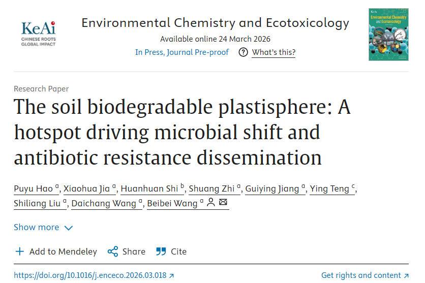 土壤培肥与耕地保育创新团队在可生物降解塑料生态风险研究方面取得重要进展,研究成果以“The soil biodegradable plastisphere: A hotspot driving microbial shift and antibiotic resistance dissemination”为题,在线发表在环境领域权威期刊《Environmental Chemistry and Ecotoxicology》(SCI一区,影响因子8.2)。